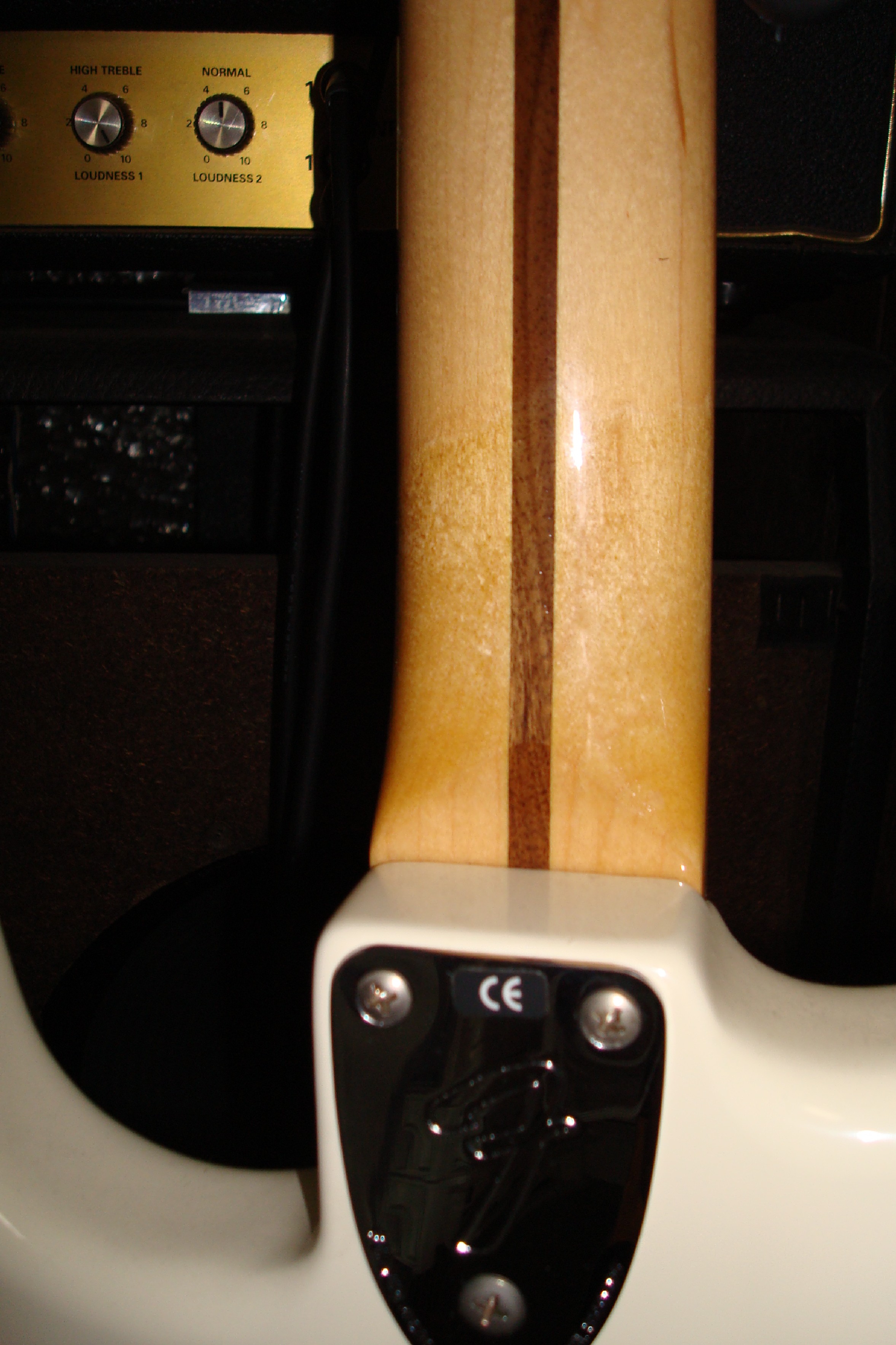 上記写真の参考として載せているSmallヘッドはFender Japanで2002 - 2004ごろの製品。こいつは逆に、1976年のラージヘッドのように、