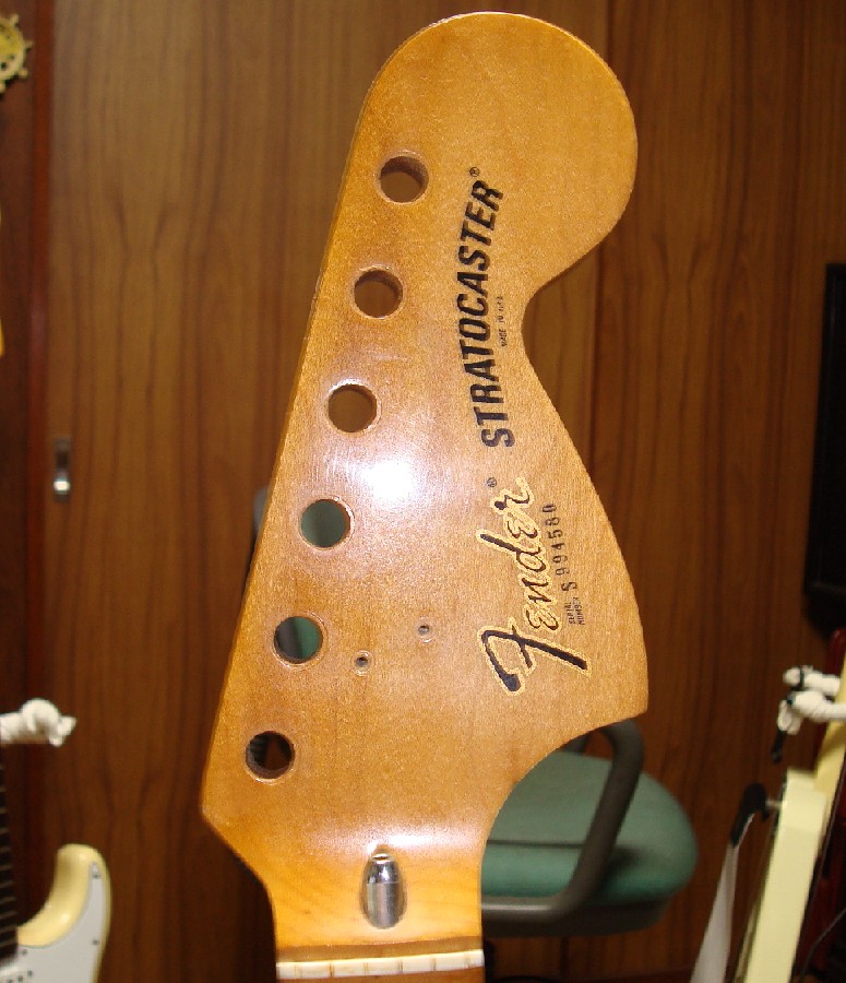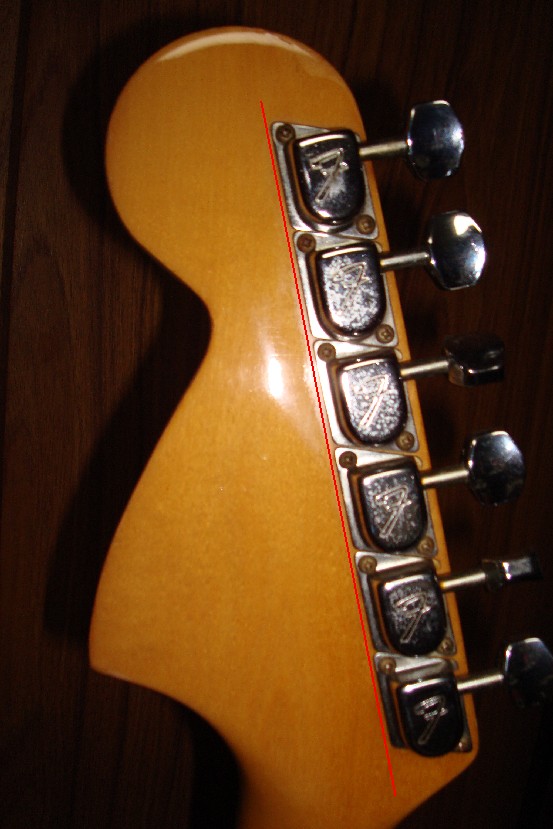 現行Fenderは、ナットからヘッド・トップまでの長さが短い上にトップの円の径が大きく、Stratocasterロゴマーク下のざぐりカーブのRは小さい。以前の物はRを大きくえぐっている。